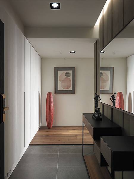 玄關天花以低調的嵌燈作為照明,灰石地板不僅耐髒同時展現此區的沉穩,