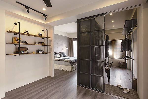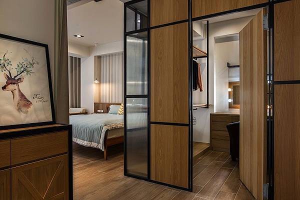 阻擋開門見床的視線,並加入符合習性的機能分配,並結合鐵件、融入木紋元素,