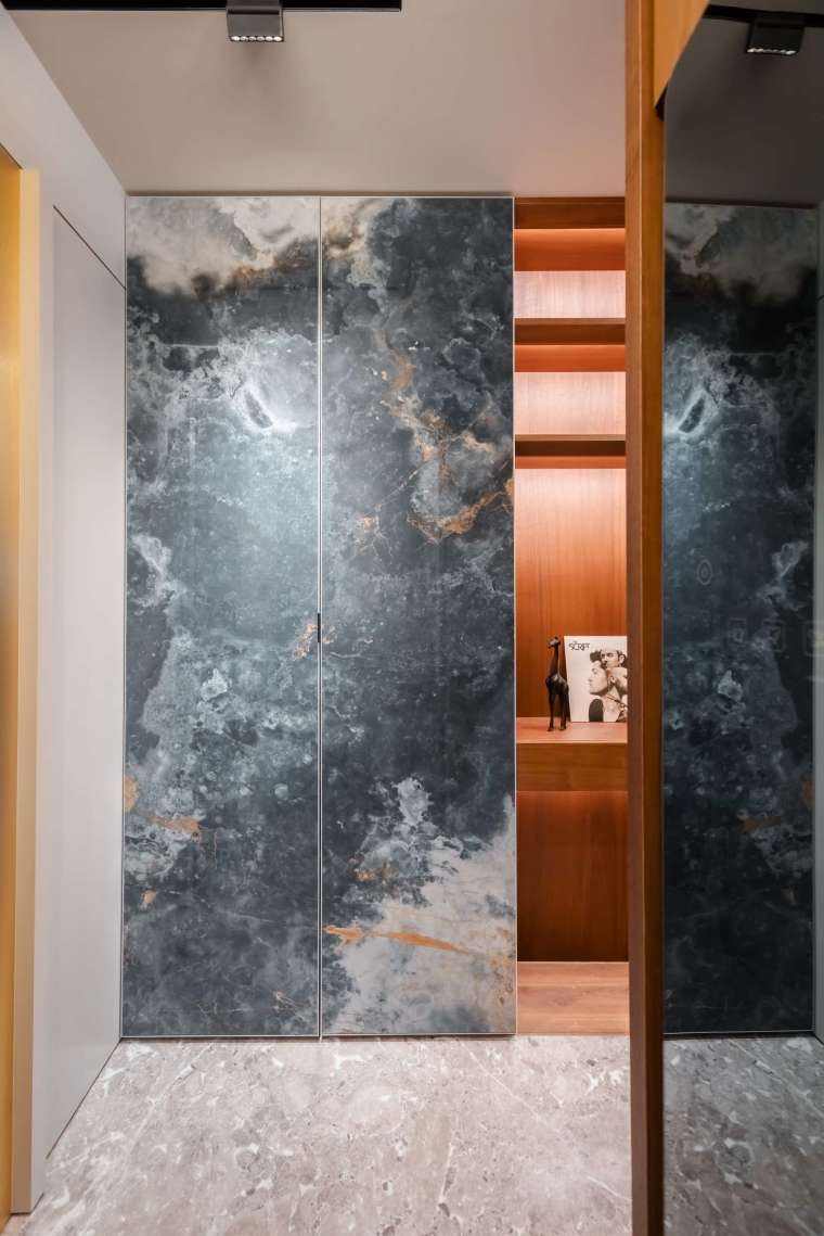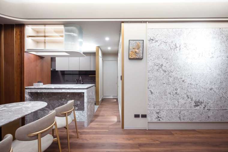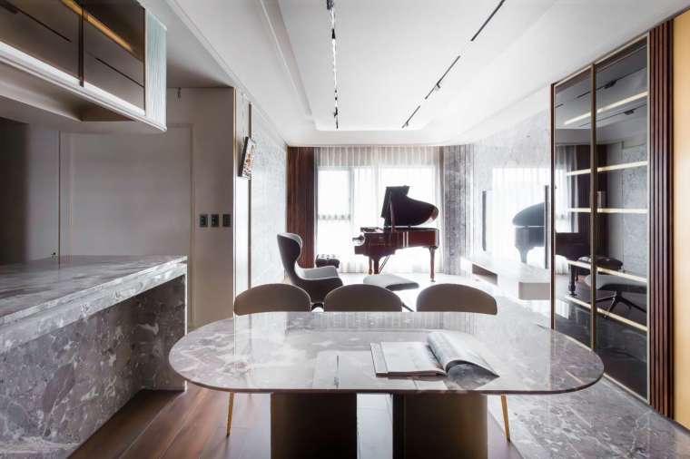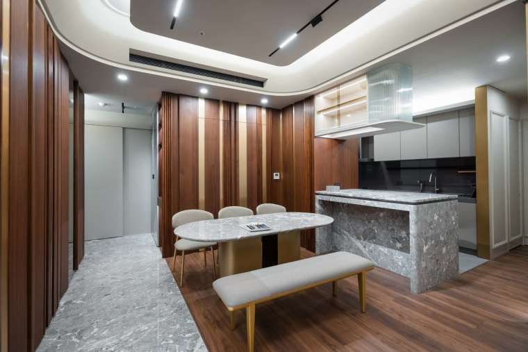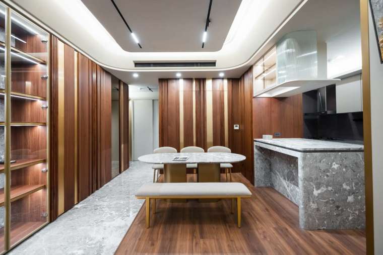 天花的弧線收邊,塑造出內凹的穹頂效果。夜裡燈帶啟動時,光暈沿著弧面緩緩推進,彷彿時間都慢了下來;另外搭配線條燈與磁吸式軌道燈,提供彈性的照明邏輯,令平常日與款待賓客之間能迅速切換。主臥室內設有更衣室,動線井然有序;餐廳後方另闢儲物間,進一步鞏固生活便利性。甚至在玄關入口處安裝一片特選大理石,替來訪者拉開序幕,暗示這裡是一個秩序鮮明的場域。