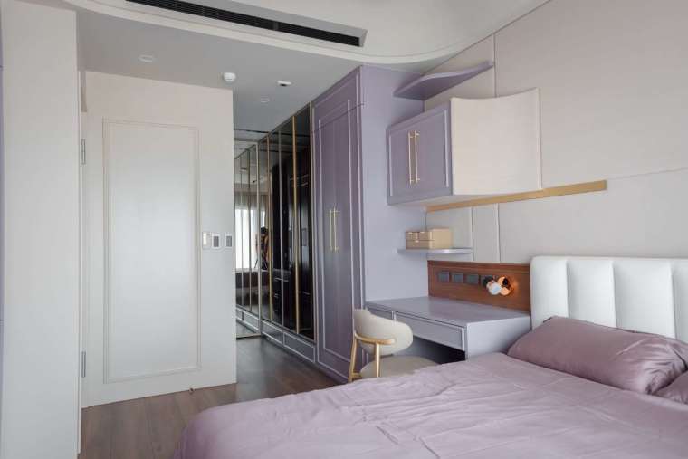 原始三房格局被重新劃分為二房加上一間開放式書房/琴房,讓音樂練習、教學與親子互動在同一片視線裡自然發生。原本封閉的廚房打開後,與客餐廳相連,形成一條清晰路徑,使家庭的社交活動凝聚在開放而流暢的環境中。全屋規劃大量隱藏式收納,將櫃體巧妙融入牆面與造型之中,機能被妥善配置,並順勢維持整體畫面的純淨。