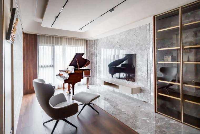 走進本案,最先映入眼簾的是靜靜佇立在客廳的大鋼琴。琴鍵的光澤,彷彿為家的主題奠定基調,沉穩且充滿生命力。屋主是一對年輕夫妻與兩位孩子:先生為知名牙醫師,太太乃是知名大提琴音樂家,生活步調需要同時容納專業演出與家庭日常。因應這樣的需求,設計師重新梳理格局,讓家能隨著舒適節奏緩緩展開。