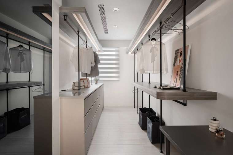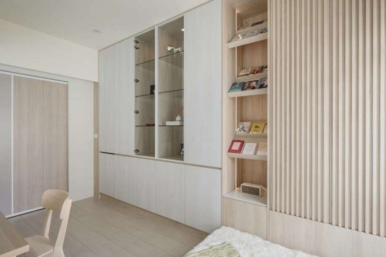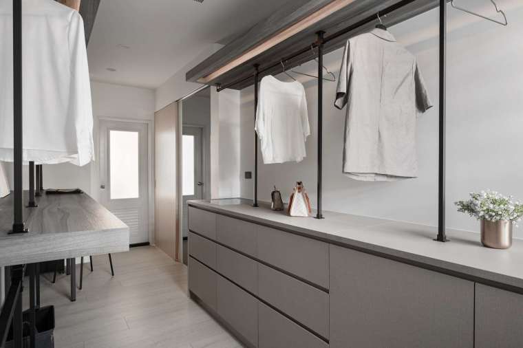基地為中古屋,整體空間約 42 坪,原先四房格局改為三房,使更衣室與開放書房能自由運用。玄關以長虹玻璃阻隔,替動線帶來巧妙的轉折,也為室內注入更多光影變化的期待感。開放書房則以玻璃隔間放大視覺與採光,同時保有獨立性與通透感。此舉讓公共空間更顯寬敞,同時維持私領域的合宜比例,實現舒適自在的居家體驗。