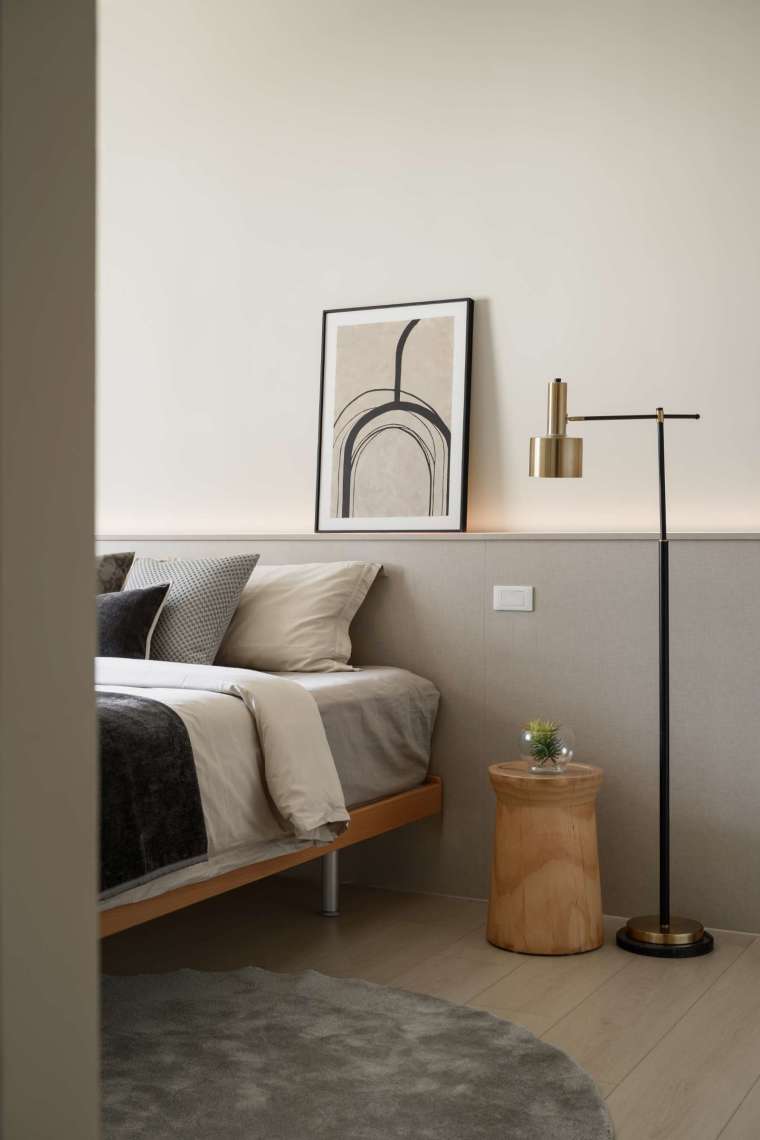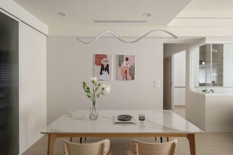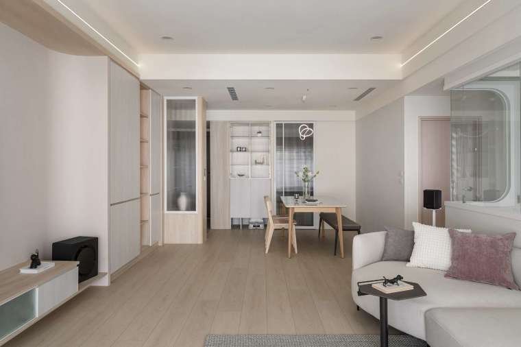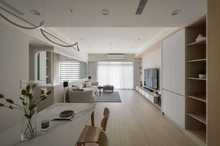 公共空間以淺色調呈現開闊感,並在局部運用鍍鈦細節點綴,為整體增添一抹優雅光澤。線型燈帶勾勒出現代簡約的設計語彙,也呼應了業主渴望的溫暖居家氛圍。在電視牆融入微粉橘與木質元素,形成自然樸實卻不失細緻的空間表情。