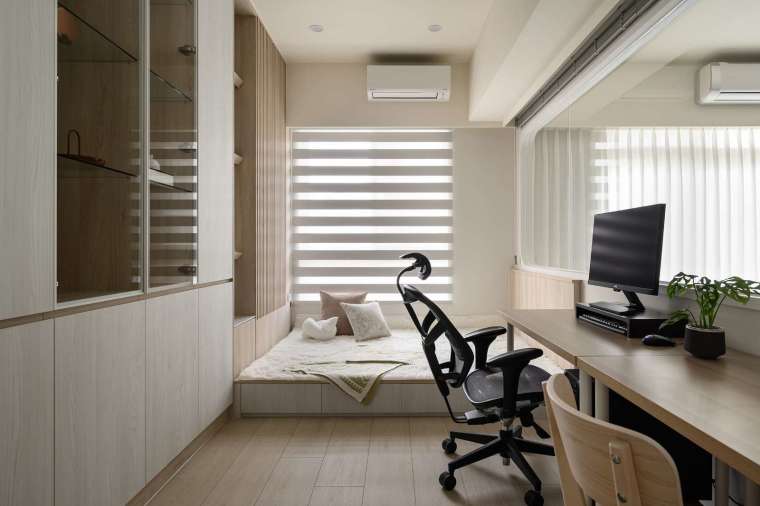 設計師在書房中打造多元空間,平日可作為辦公與閱讀領域,假日則能切換成舒適的客房。書房裡的臥榻成為休憩或陪貓咪玩耍的角落,而精緻木紋書架則提供大量書籍的收藏與陳列,同時也增添人文雅趣。這種彈性運用讓日常生活與接待需求輕鬆切換,展現空間高度的可塑性。