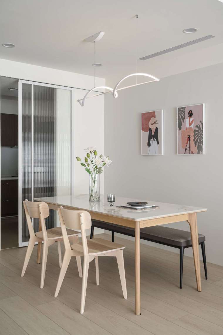 本案採用班傑明漆與立邦乳膠漆營造溫潤色澤,並利用長虹玻璃作為局部隔屏,強化光線穿透與視覺美感。牆面與收納櫃大量運用環保系統板與實木皮,突顯木質調的溫暖層次。鋁框與鐵件則作為結構與點綴元素,穩定整體結構之餘也增添現代俐落感,讓風格在柔與剛之間取得平衡。