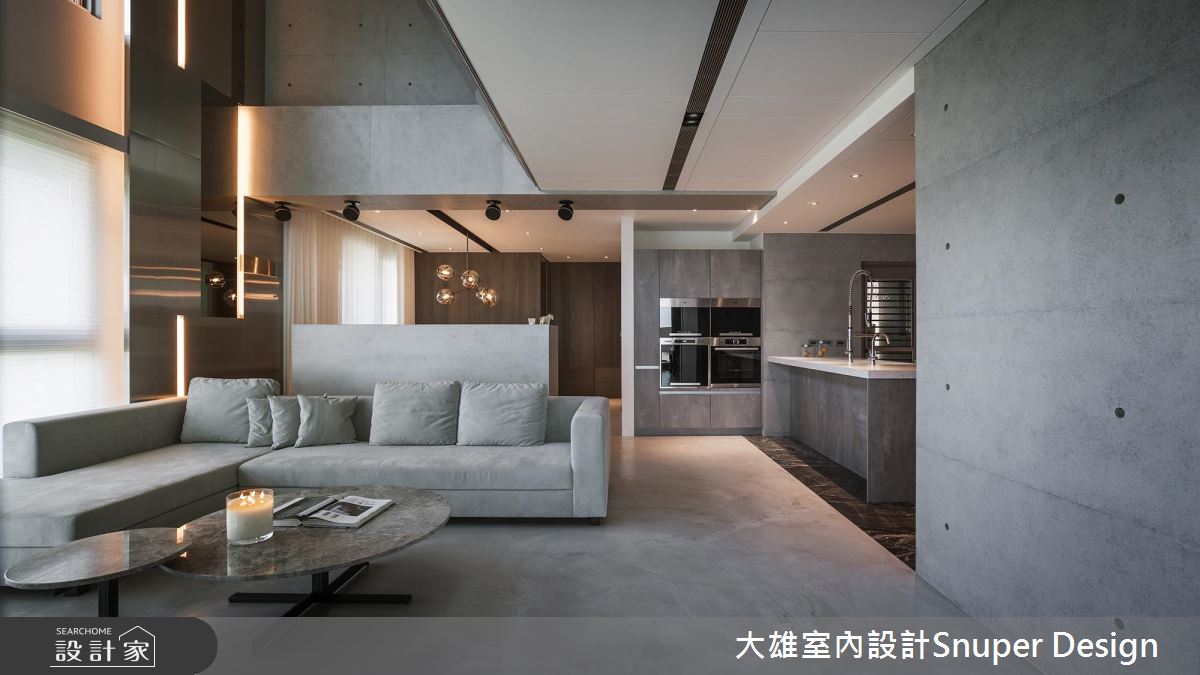 純粹、自然的水泥色調和質地,給予空間踏實和穩定的感受,而具有穿透性的玻璃則顯得輕盈而自由,設計師利用水泥、玻璃介質的共生,形塑材質的虛、實對比,也達成了微妙的視覺平衡。在開放式的空間中,筆直而俐落的線段交織、穿梭於客廳、餐廚與祭祀區的視野之間;不鏽鋼光牆與水泥梯階,則成為拉開垂直軸度的延伸力度,撐起空間的開闊尺度,以及大面幅高樓層窗景,並將窗外的自然光景引植室內,與生活之間成為不可分割的一體。位於複層上方的私領域,外部採用玻璃隔間,形構上下空間的對話互動,像是兩個在視覺上相互交疊的玻璃盒子,藉著不同角度的觀看、凝望,重新詮釋了空間的內外定義。