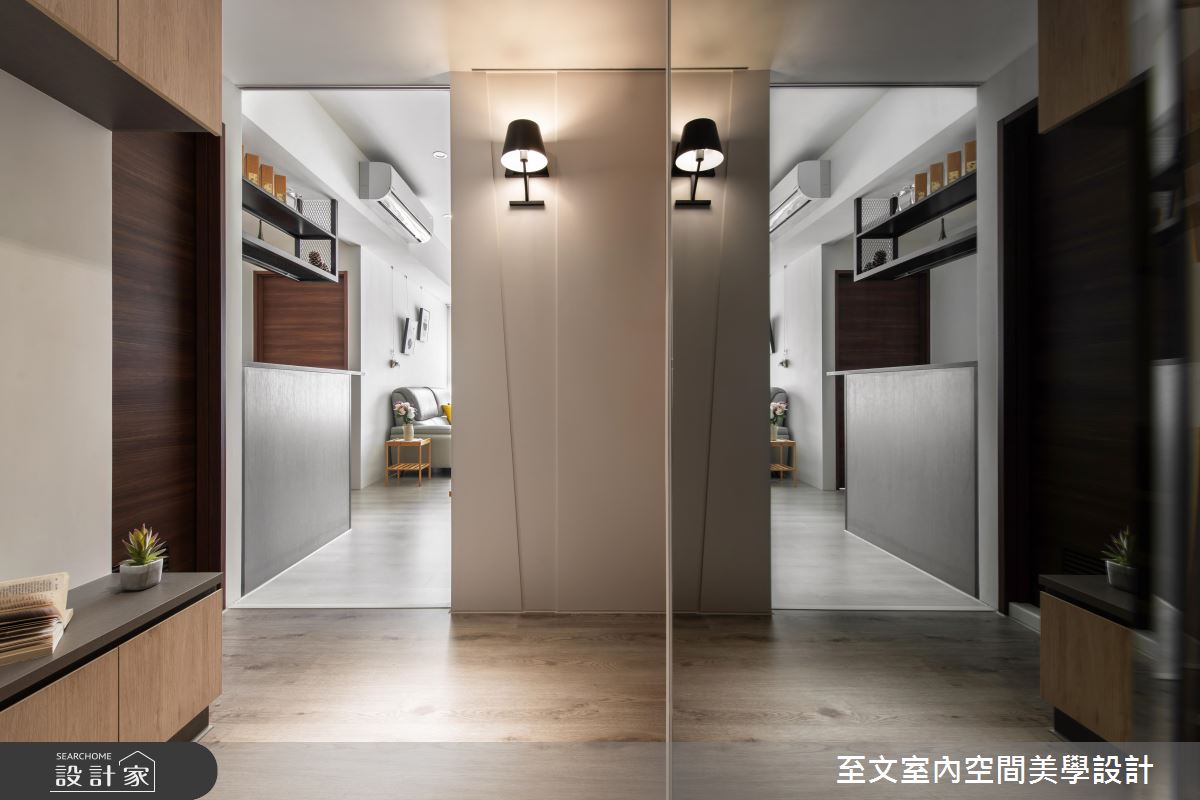 21 坪居家,設計師依循年輕夫妻的居住需求,於空間挹注簡約風格,並針對動線與格局重新配置,重塑新的入口玄關,搭配彈性拉門的規劃,讓空間使用更多元,快跟著小編一起來看看吧!玄關區域刻意轉換地坪建材、界定落塵範圍,並打造木作造型橫拉門,與室內公領域做出場域界定,且加入壁燈與鏡面照亮空間,開啟明亮溫馨的入
