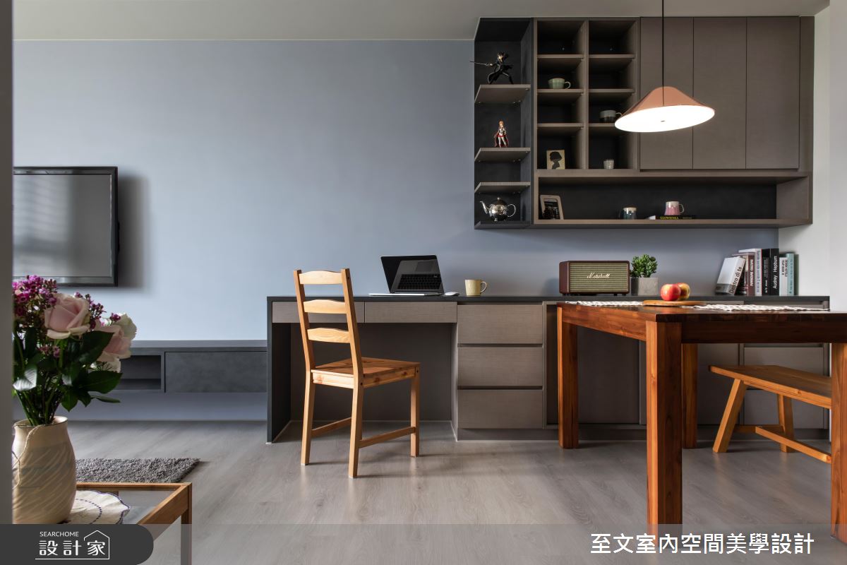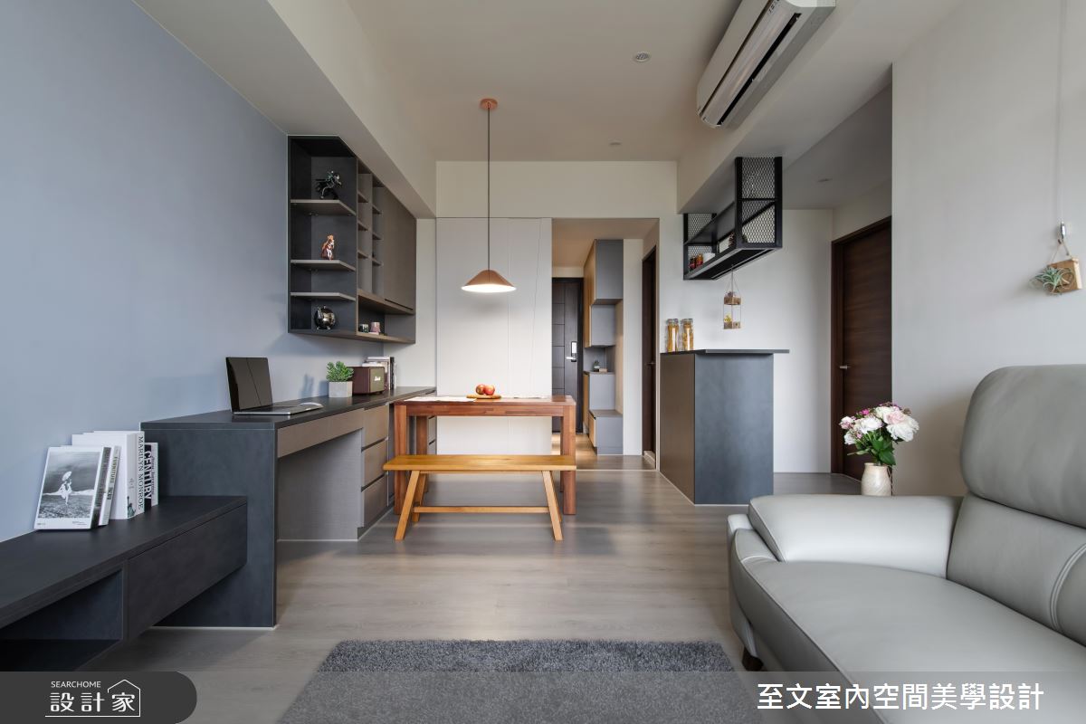 玄關區域刻意轉換地坪建材、界定落塵範圍,並打造木作造型橫拉門,與室內公領域做出場域界定,且加入壁燈與鏡面照亮空間,開啟明亮溫馨的入口風景;開放的客餐廳,以電視櫃串聯書桌平台,將機能集中在同一道立面軸線上,形成一體成形的量體,讓出更多的空間感,也藉由共用陪伴的使用情境,拉近家人相聚的時間;色彩與建材上,則選用淺灰藍與白色作牆面襯底,家具轉換為顏色較深的色調,跳出對比的俐落風采;同時在廚房門前配置小吧檯,除了備餐使用,也兼顧電器櫃功能,再於上方懸掛輕巧的噴黑鐵件吊櫃,形成輕盈且具個性感的半空焦點!