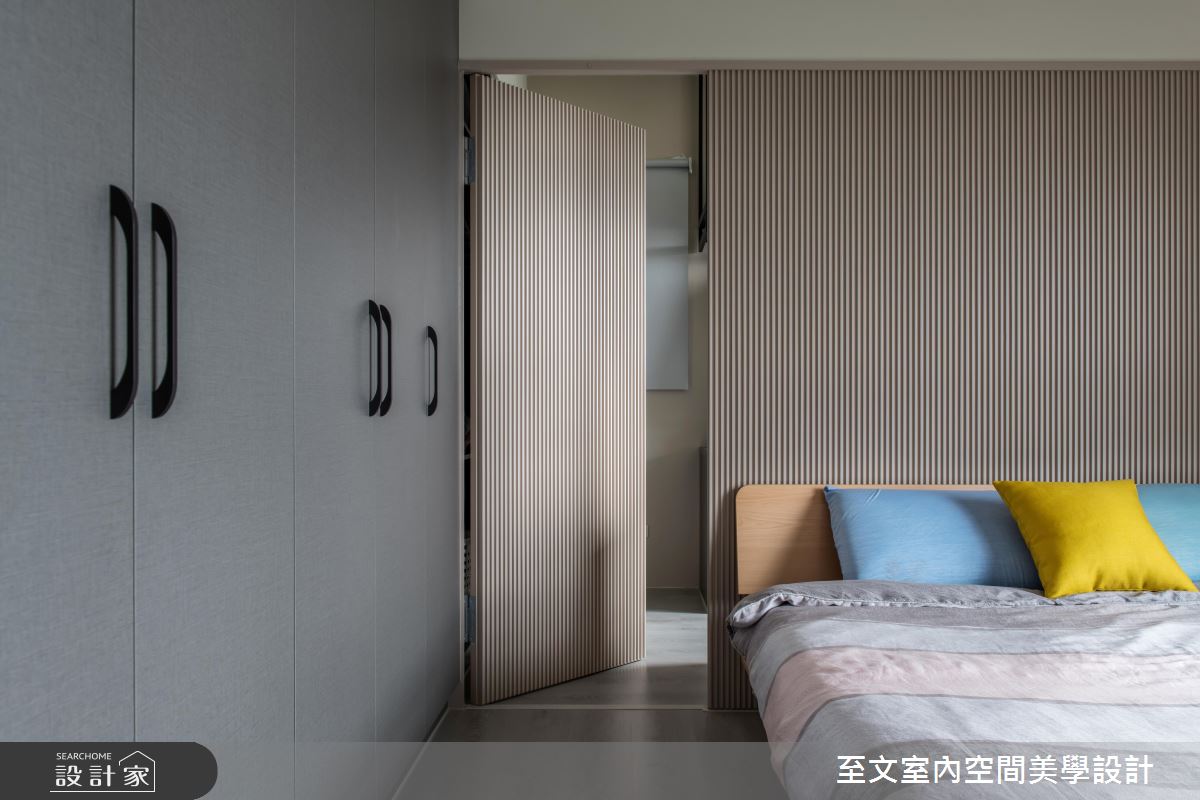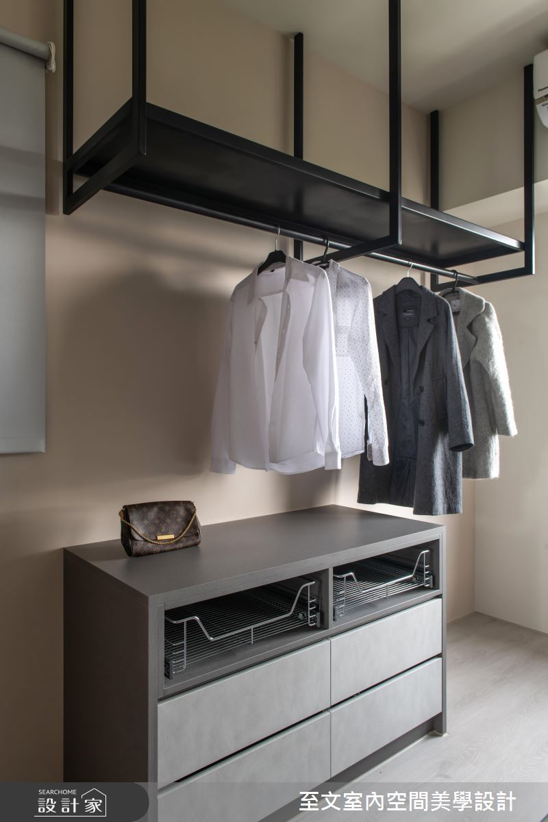 主臥於床頭加入線條律動,不著痕跡地隱去更衣室的通道口,讓牆面顯得俐落有型,並於更衣室內安排簡約吊衣桿,營造舒適便利的更衣場域!