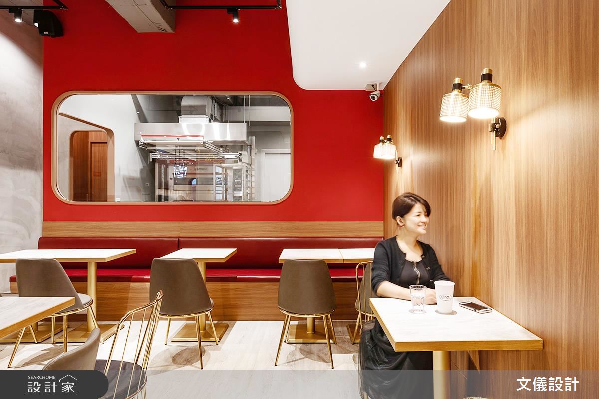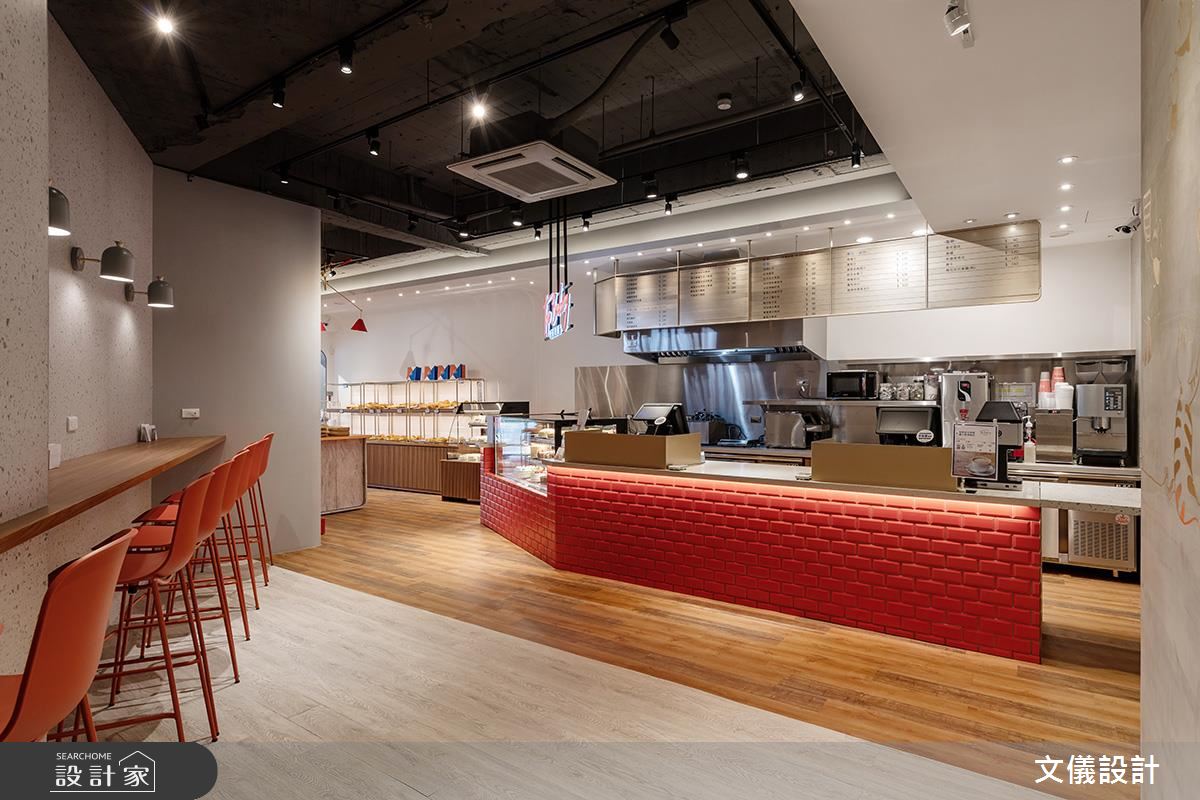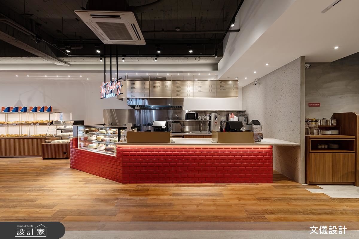 熱騰騰的麵包出爐囉!47 坪現代風烘培坊,迎賓櫃台及高腳椅區,以紅色意象大膽詮釋定調空間主色,不自覺挑起了顧客食慾,優雅大方的白色牆面,則象徵各式麵包的精緻口感,塑造享用麵包也能時尚又精緻空間概念!