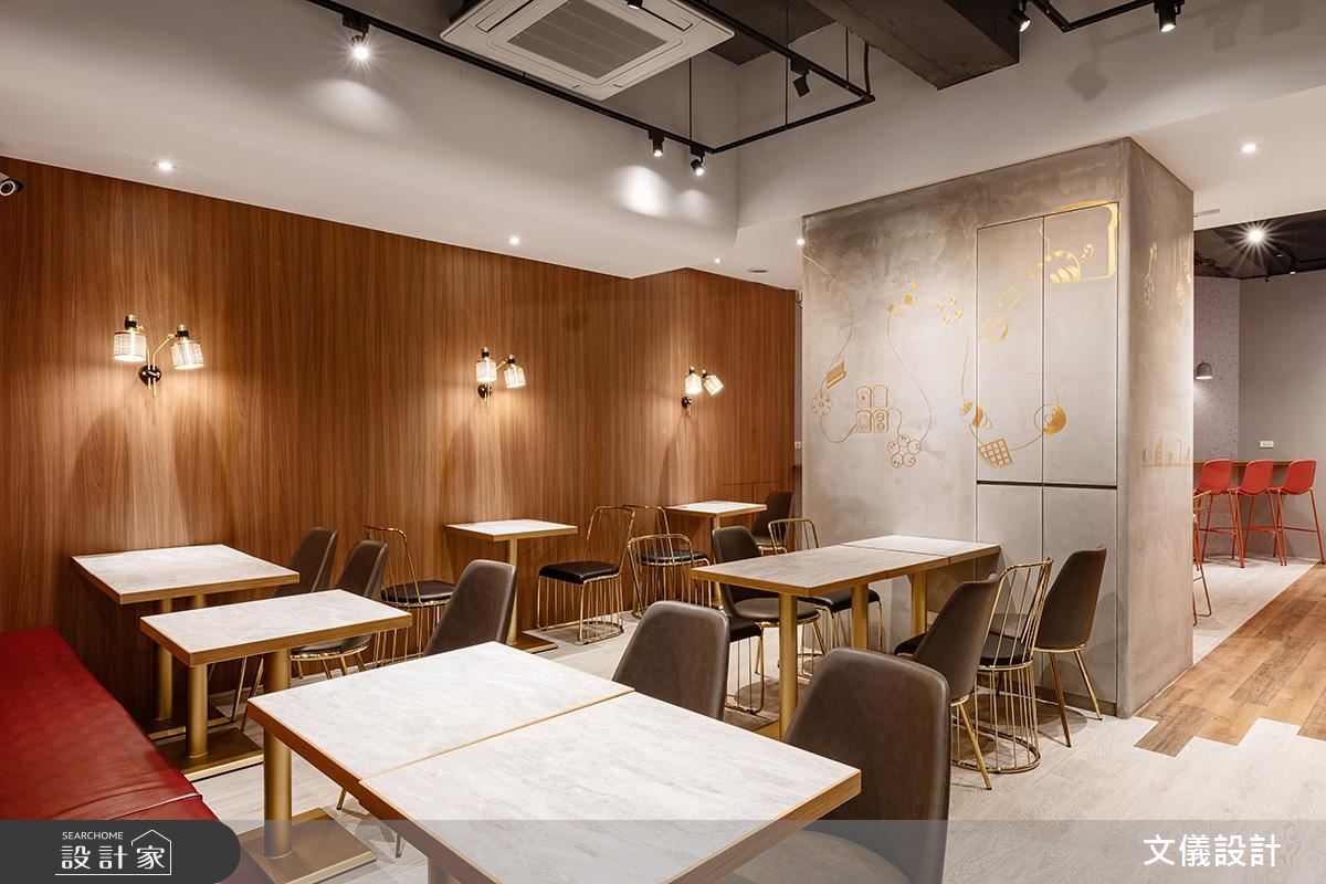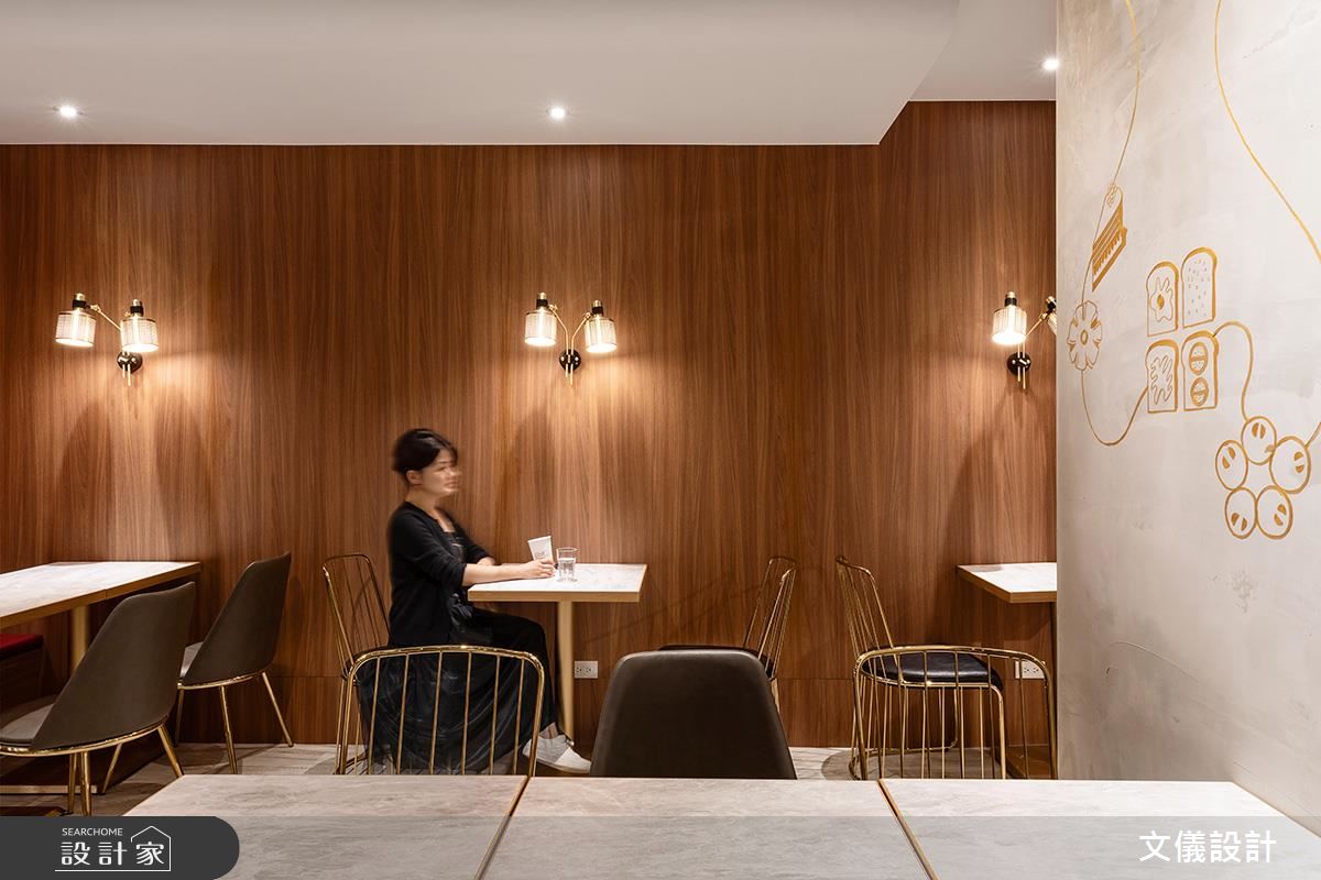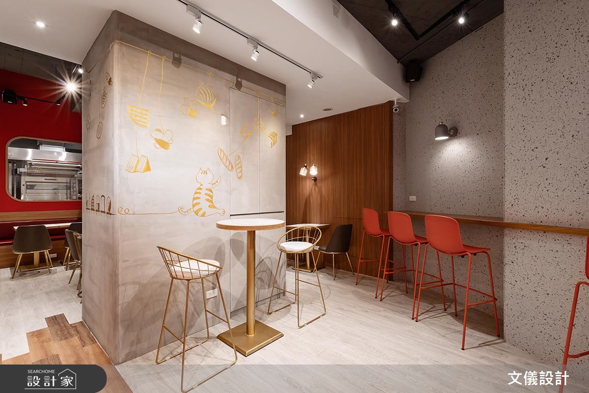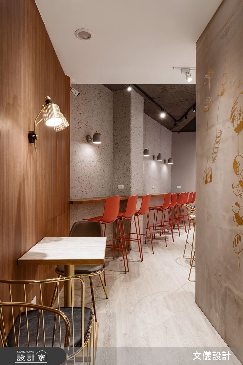 入口販售區純淨優雅的白牆,讓各式麵包大方陳列,搭配帶有弧度的木作、金屬層架,以視覺感染味蕾,增添麵包精緻口感。收銀區紅色鐵道磚牆,搭配紅色高腳椅,帶出活潑熱情意象,順勢引導入座動線。沿著高腳椅走進內部座位區,改以深色系木頭賦予些許沉穩,立面的金屬手繪牆與金屬勾邊單椅,點亮木質地坪、灰質樂土牆面,創造時尚用餐氣氛。