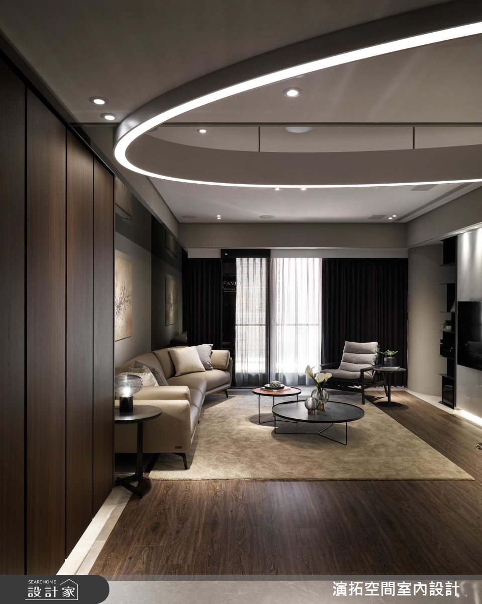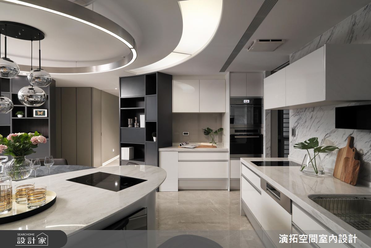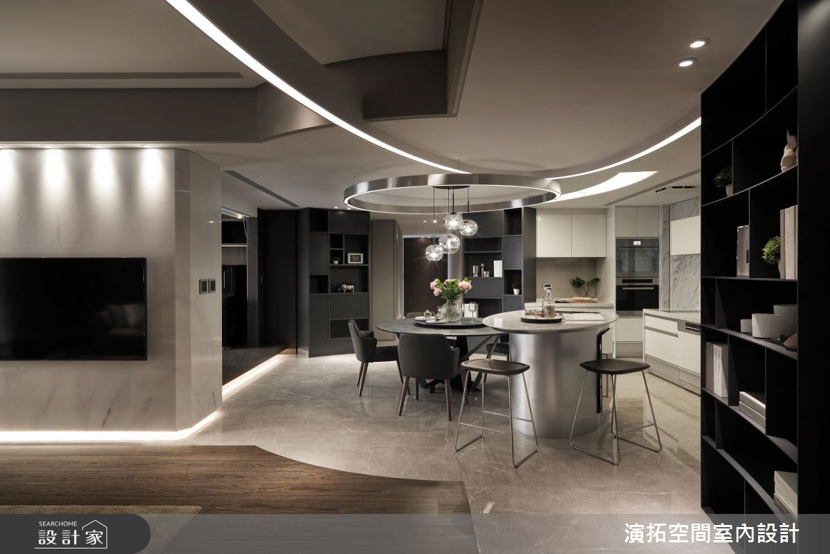 公領域從地面、天花板到中島吧檯,全都採用圓和橢圓的幾何形象,去串聯起玄關、客廳和餐廳,模糊彼此格局界線,完成了一個廣大的家人來往空間,使動線順暢無所阻礙。客廳電視牆採用白玉大理石妝點,搭配底下的光帶,塑造輕柔優雅的視覺,而採光面則利用上面印有「Family」的夾紗玻璃,象徵一家人的凝聚力。