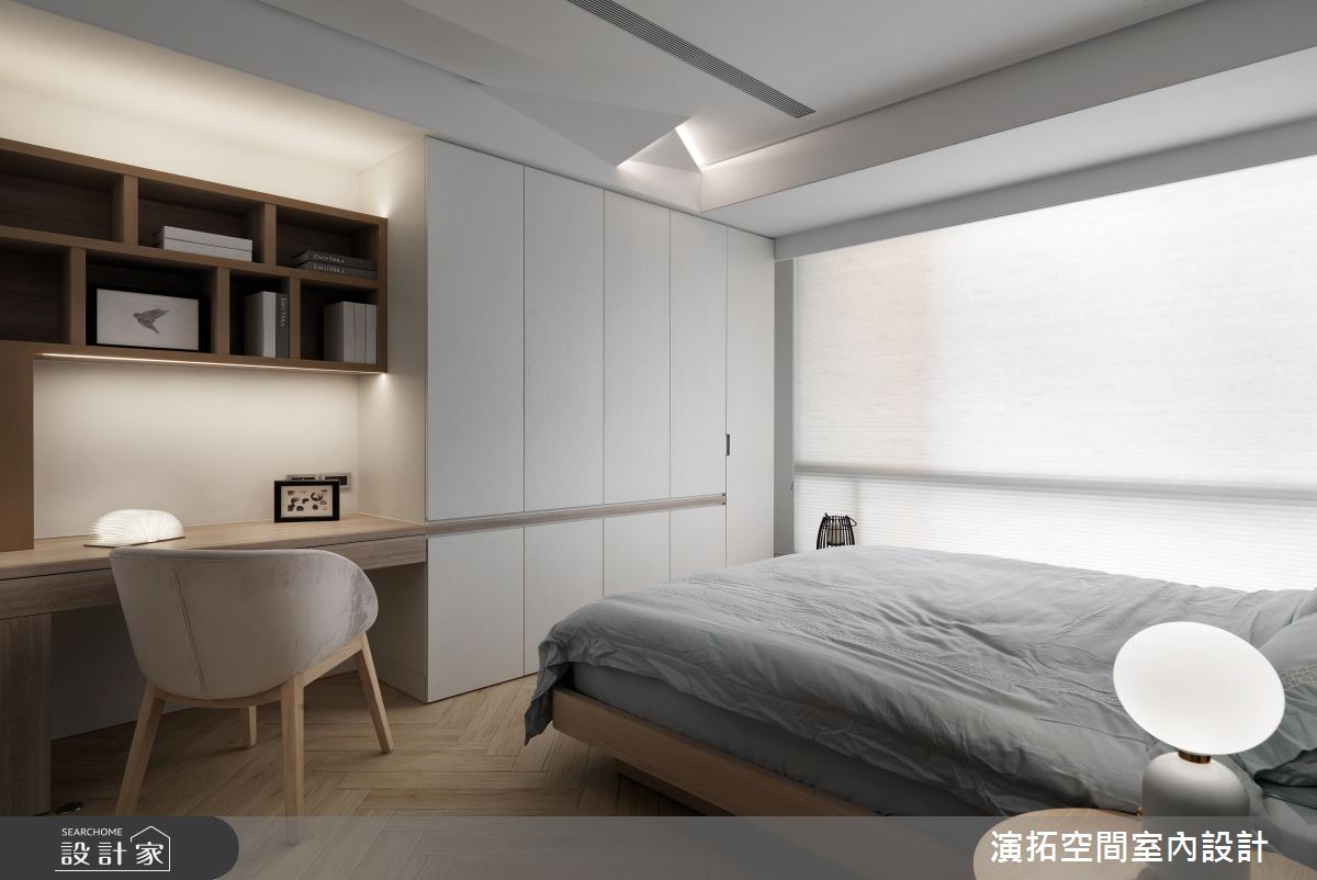 次臥床頭牆藉由白色跳跳燈,凸顯出空間的清新活力,而整齊收納櫃上方,運用三角形的幾何元素,來設置柔和的間接照明,提升了白色臥房的視覺變化。
