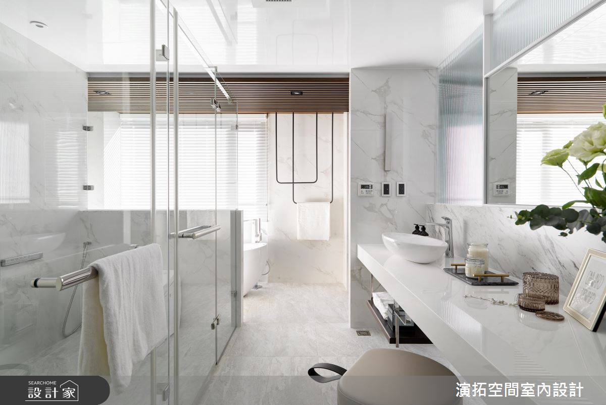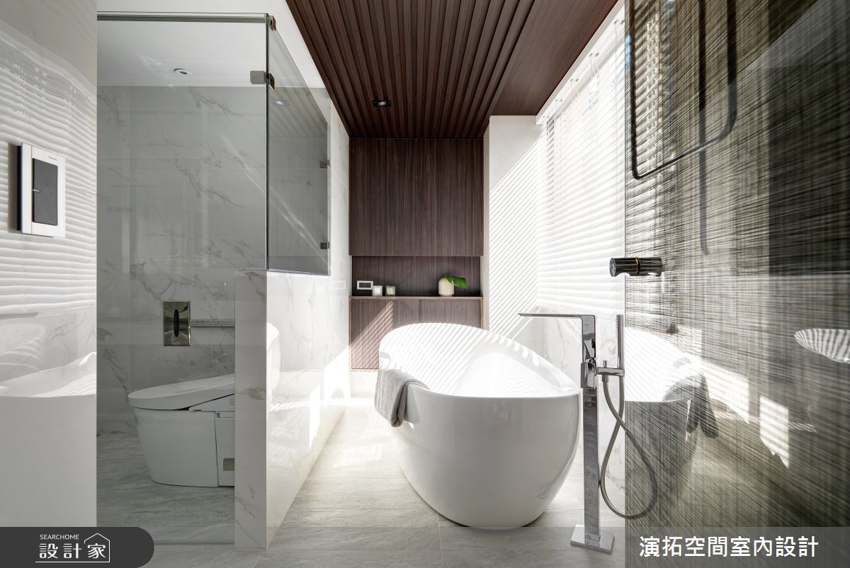 餐廳櫃體依循著天花板的圓弧造型去做設置,且照明與餐桌上下呼應,定義了現代時尚的用餐環境。主臥突破一般制式的空間配置,透過回字動線與帶有穿透感的隔間,把床鋪、更衣室和浴缸收攏在一塊,同時格柵天花板的線條延伸,放大了主臥的空間感,讓人可以一整天都舒服地待在私密場域,獲得滿盈的療癒能量。