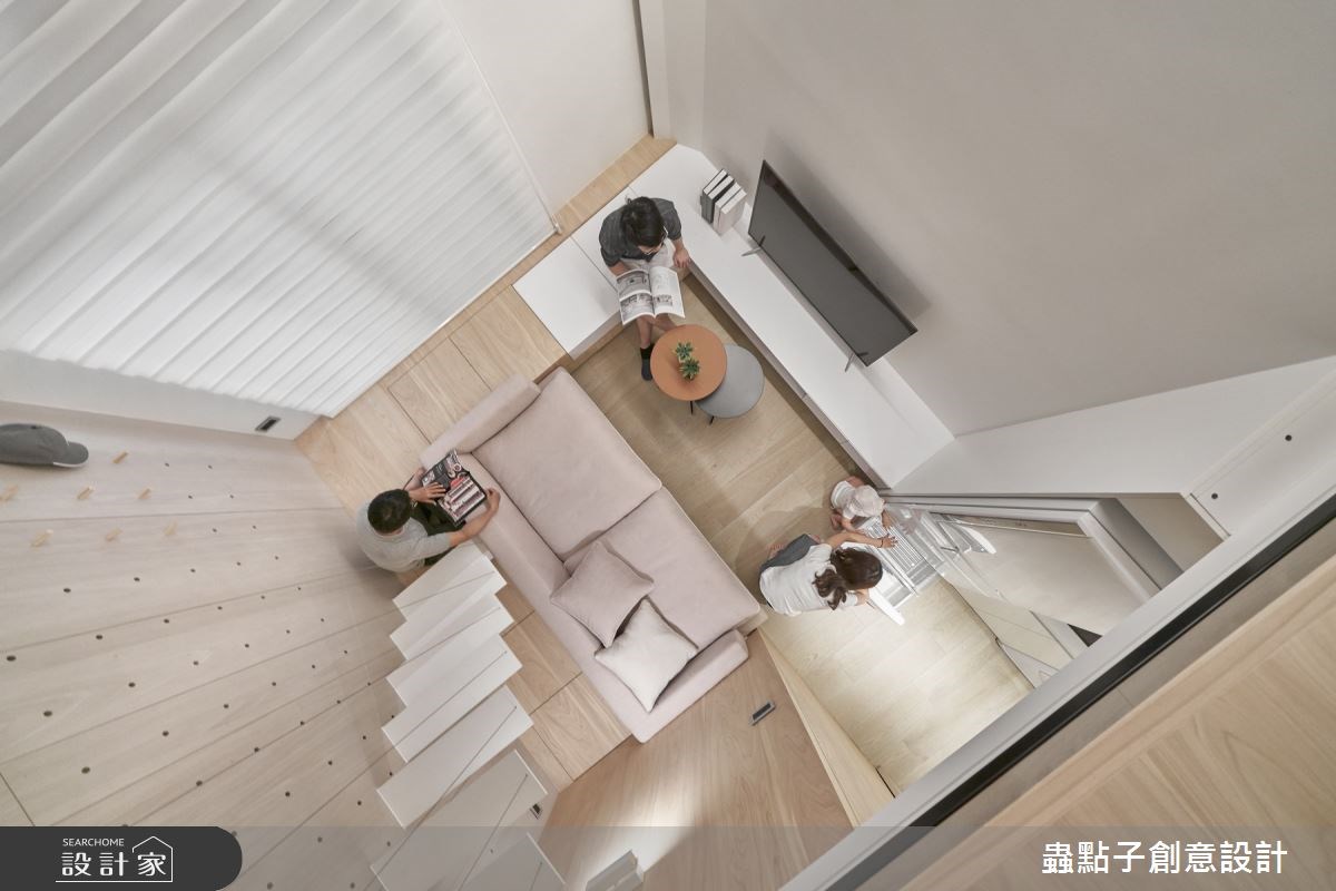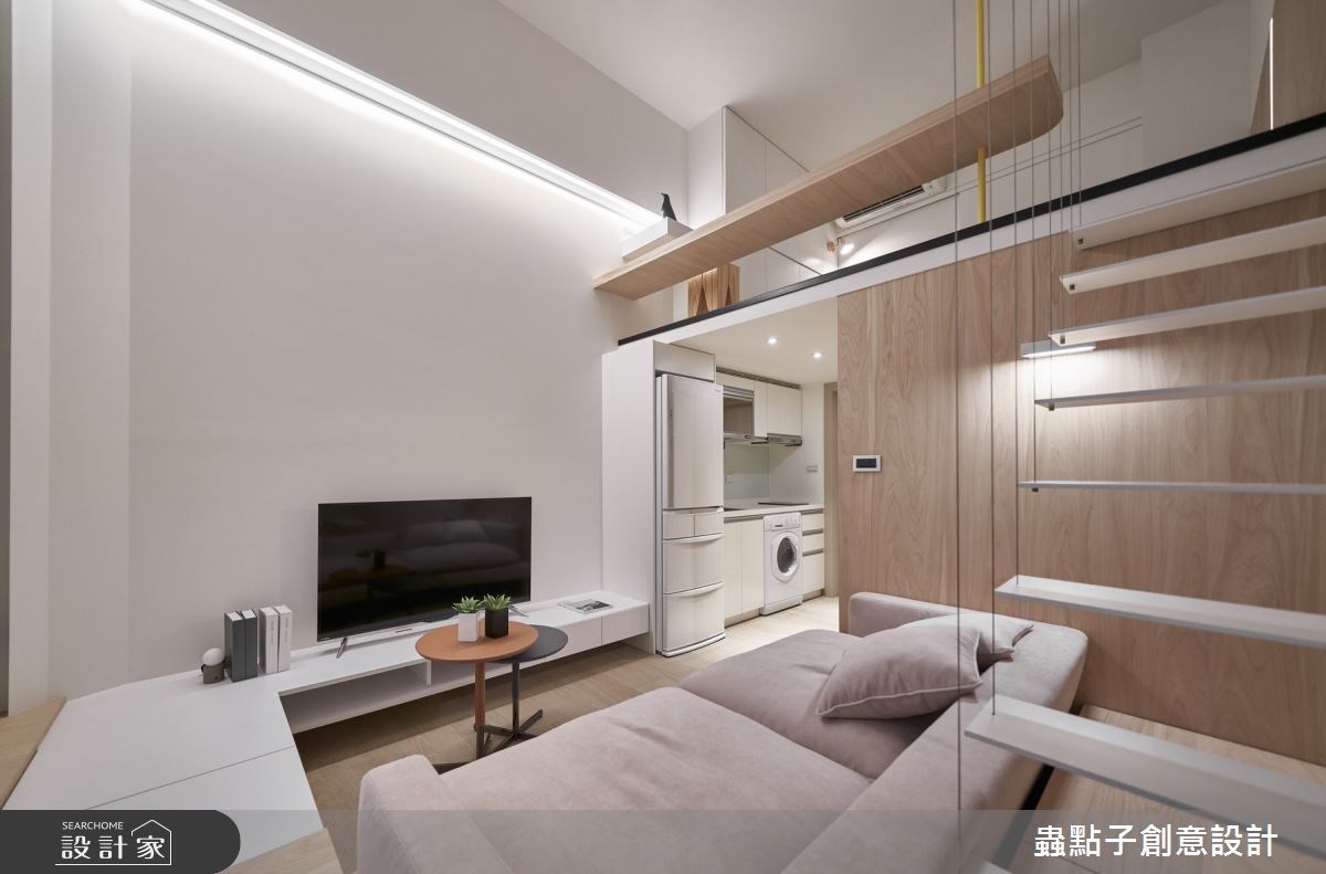 只有五坪大的迷你宅,因為屋主長期在國外工作,希望回到台灣有個能夠放鬆的地方,因此蟲點子設計以簡單溫暖的基調為主軸,並運用設計巧思讓極小坪數能發揮最大功效。 原始屋況挑高約4米,長寬都不大,因此設計師將下層作為休息放鬆的開放空間,上層則為私領域。在設計手法上利用垂直向度關係將樓梯、沙發及電視櫃整合,保留沙發上方的開闊感,讓陽光與氣流能恣意在空間中穿梭。