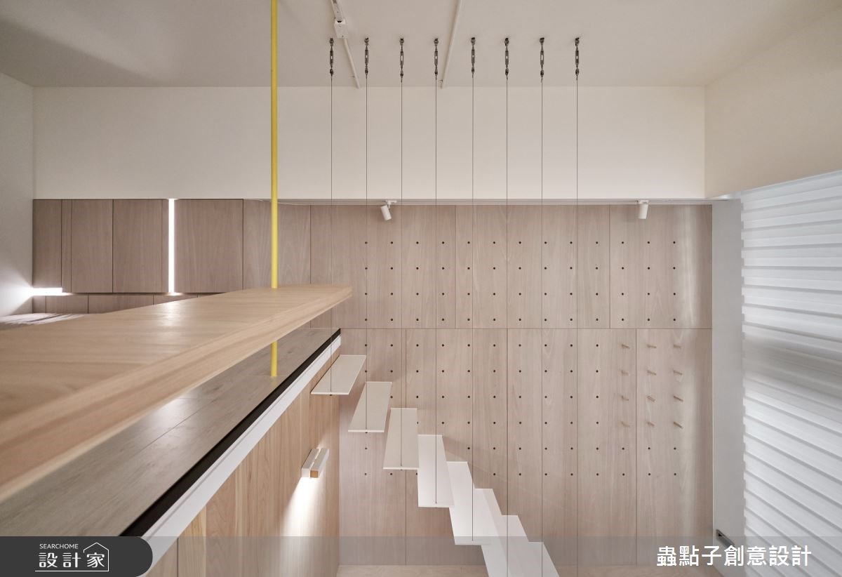 原始屋況挑高約4米,長寬都不大,因此設計師將下層作為休息放鬆的開放空間,上層則為私領域。在設計手法上利用垂直向度關係將樓梯、沙發及電視櫃整合,保留沙發上方的開闊感,讓陽光與氣流能恣意在空間中穿梭。從大門入內右側為廚房,左側則為衛浴空間,保留原本建商附的廚具,並延伸其白色至客廳電視櫃及窗邊臥榻,再沿著漂浮樓梯到二樓,樓梯造型更成為沙發背牆的造型端景。上層的扶手特意設計為桌板形式,方便屋主使用電腦,L型的整面衣櫃還結合一個小小的梳妝台滿足衣物收納與整裝。
