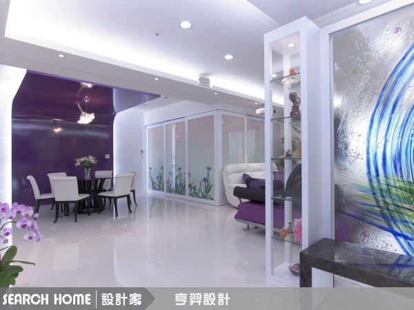 以白色為主色調的公共空間,配上浪漫華麗的紫色織品軟件,營造出現代優雅的居家氛圍。