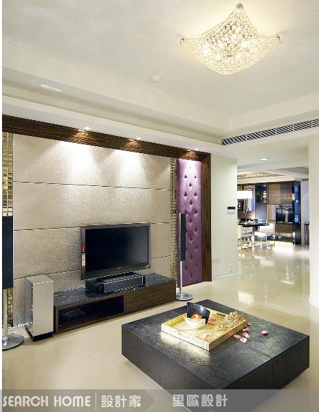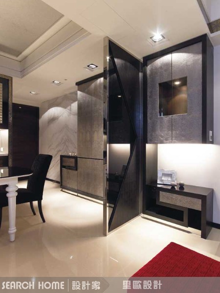 女主人喜愛時尚,也因此偏好低調奢華風的居家風格。設計師偕志宇於是大量的利用鱷魚皮革,佈置出空間的時尚感,同時利用雙層雕刻玻璃、水晶來表現空間的華麗與質感。