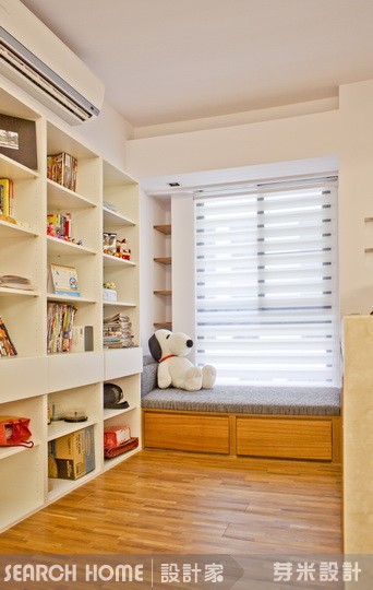 書房靠窗規劃休憩平台,可臥可躺,平時可以在這裡看書休息,一家人也可以在此聊天聯絡情感,充分享受減壓情境;休憩平台下方規劃收納,不但解決了書本雜物的收納問題,也讓機能使用有了更多趣味,也因此休憩平台成為現代人最想要擁有的小坪數機能規劃。