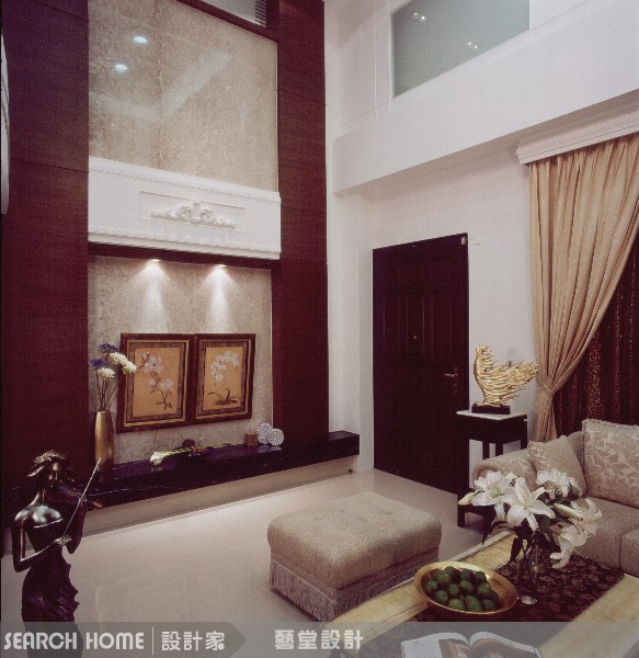 由於入口就是客廳空間,在客廳的坪數有限的情況下,設計師藉由空間挑高的優勢來創造入口的氣勢。在電視牆的設計上,藉由垂直線的設計,結合大理石的使用,讓空間感更具奢華氣派的姿態。