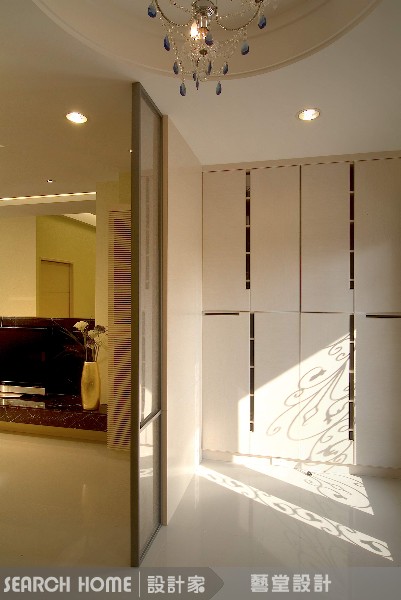 在玄關入口處除了規劃了整面牆的收納空間,在天花板上方也刻意設計了圓形造型並搭配吊燈,藉由主燈的使用,讓空間更具重心,也突顯出空間的氣派。