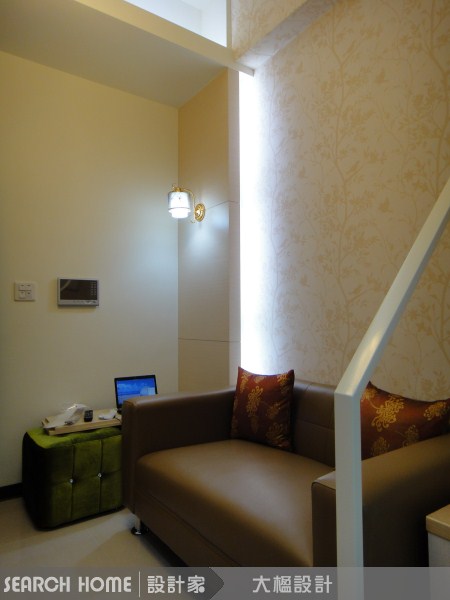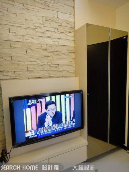 在小坪數的規劃,除收納功能的注重外,整體風格以營造簡潔、溫馨、舒適的感覺為目的。因此電視牆使用了文化石以表現質樸的質感,而與廚房的隔間則使用玻璃,以讓光線可進入室內,但又獲得區隔空間之感。