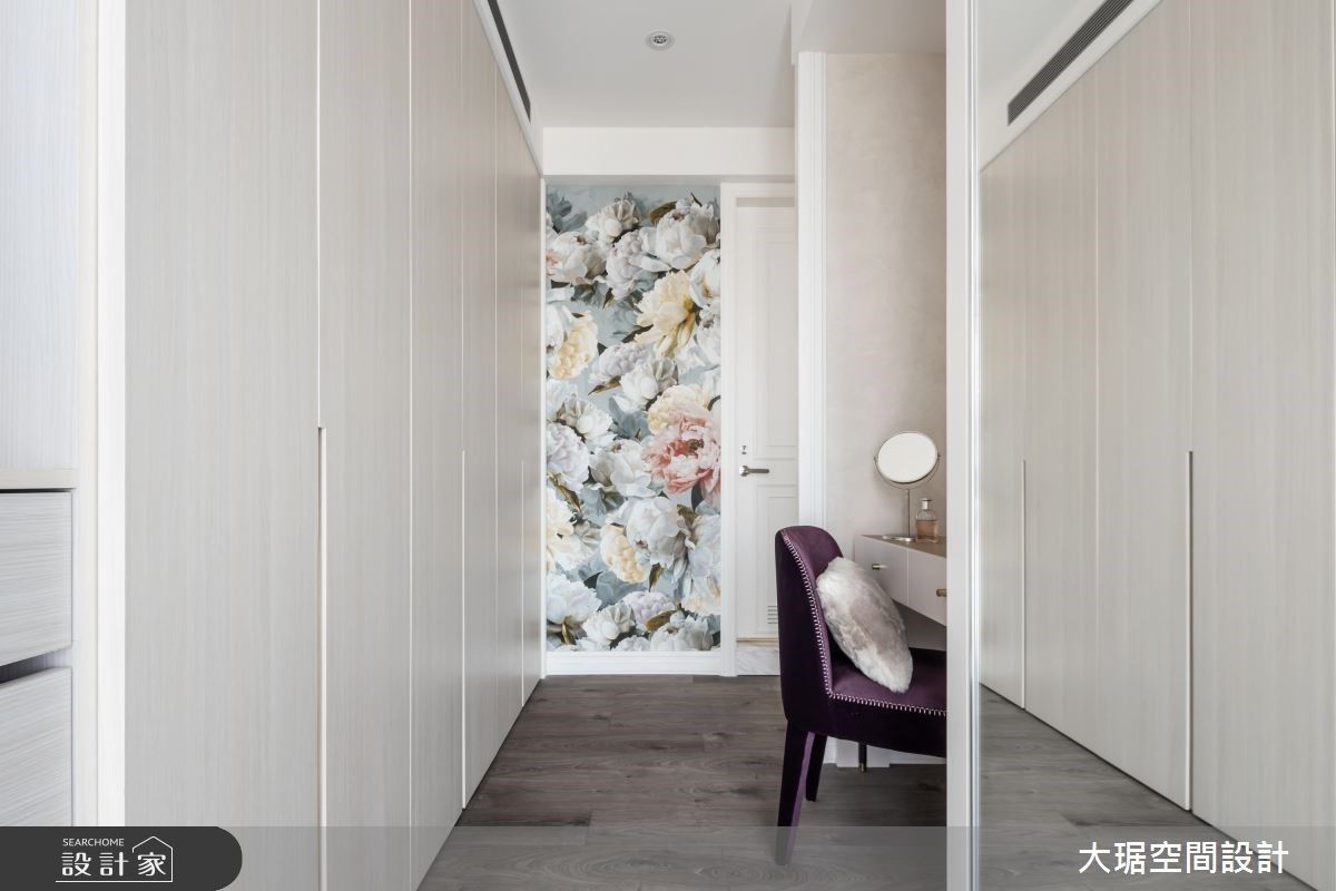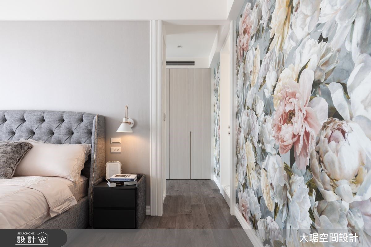 「牡丹雖好,終須綠葉扶持」。設計師將配角牆面當作主牆用,在臥房側牆鋪陳搶睛的牡丹花壁紙,並將其延續至後方更衣間,形成場域的串聯呼應。比起一整面牡丹花牆,床頭牆則選擇淡雅壁紙、顯得相對安靜,在明確的主從分配之下,可使睡眠更為沉穩安定,但放眼望去,也帶出整體的氣度。