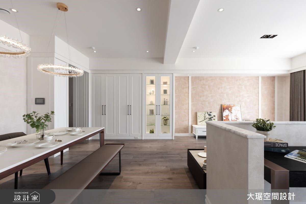 在白色空間基調下,減少彩度干擾,並跳脫電視牆常用石材的制式作法,在主牆鋪陳簡約的粉色壁紙、建構視覺亮點,壁紙選用藍寶堅尼進口品牌,兼具大自然石紋質地、又略帶水彩筆觸,細看則可見三、四種深淺層次,在陽光的照拂之下,展現如春天般的輕柔淡雅。