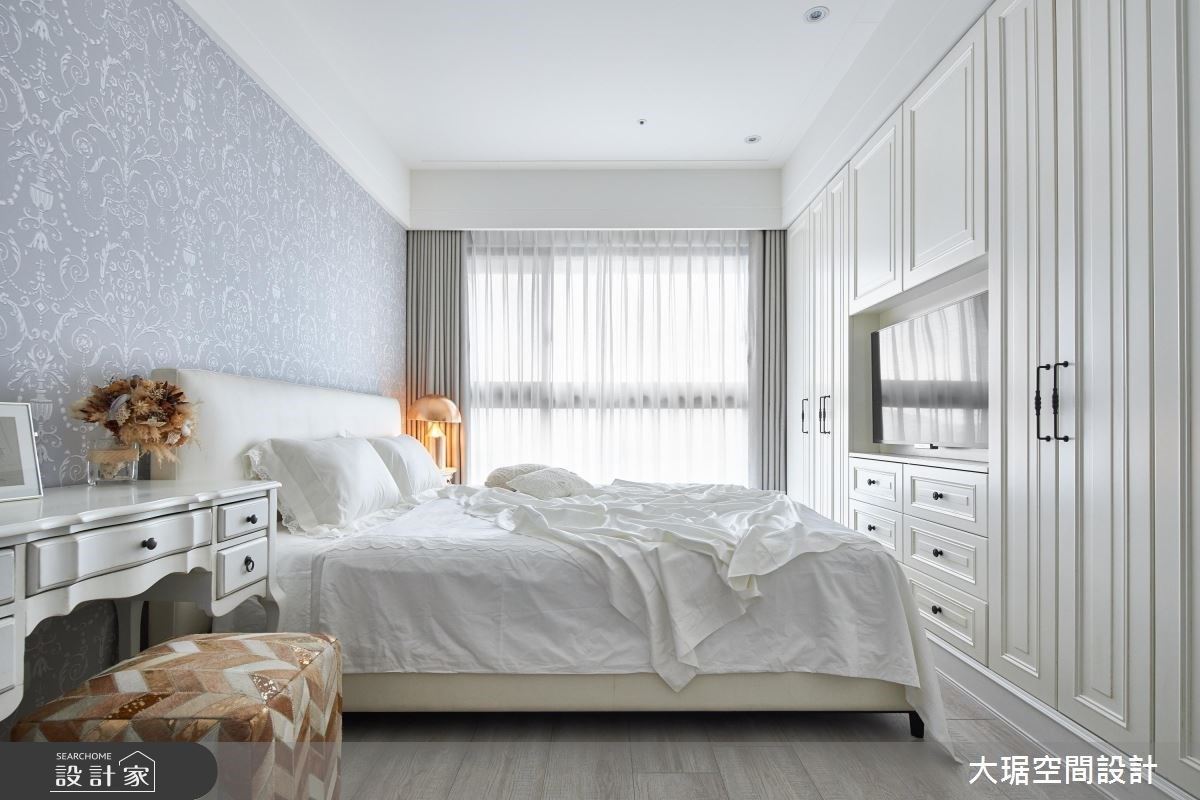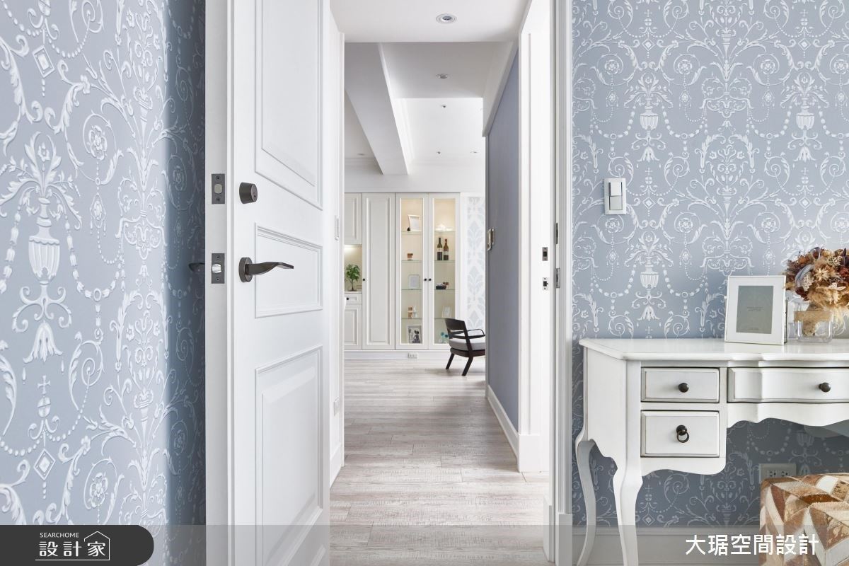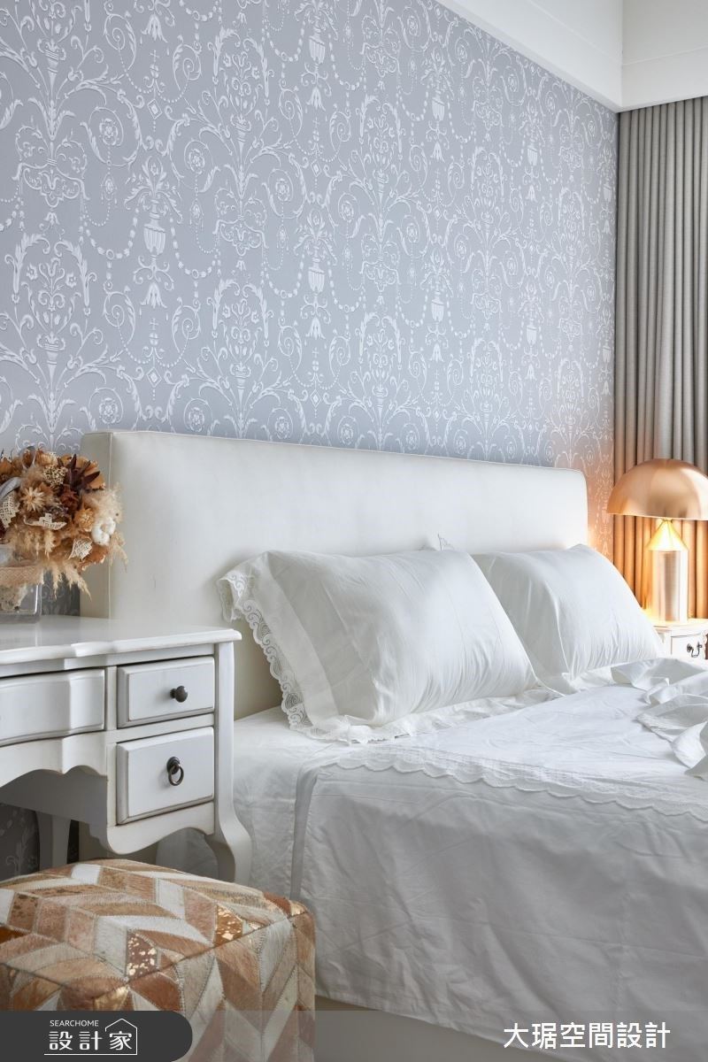 經典而優雅的美式風臥房,用線板、壁紙、燈光、軟件創造主題性格。透過灰藍與白色相間的緹花圖騰串聯房間牆面,讓硬質牆面也展現細緻質感,而簡潔的留白區塊則飾以線板,搭佐暖色調的玫瑰金燈飾、大地色乾燥花、梳妝台單椅等,展現冷與暖的諧調比例。