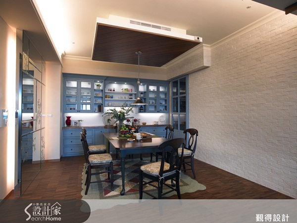 花布在美式鄉村風佔有重要地位,設計師選擇運用在臥房寢具傢飾上,此外在兒童房的壁紙上也大膽使用童趣圖騰壁紙,藉由豐富的花布與圖騰語彙詮釋不同感覺的美式鄉村風格。美式鄉村風當然還少不了粗糙建材的運用,餐廳牆就以手工做仿古處理,並製造出斑駁效果,替空間與氛圍增加懷舊氣息。
