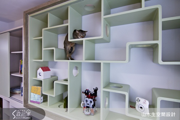 利用幾何線條的變化,勾勒出活潑的視覺效果,也利用不同大小的層板空間,滿足多元收納的機能。?