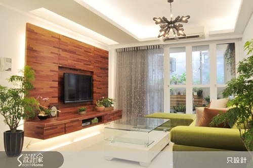 如果你家很幸運地有戶外景色,只要再利用一些自然材質的元素,就能提升整體空間的自然原味。粉色系的菩提葉夾紗玻璃門片,搭配木作貼片的電視牆,再與窗外的山景相互呼應,家就變成明亮的森林花園。