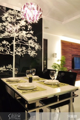 家裡不太可能搬進一棵真的樹,但透過材質與設計手法的運用,還是可以如願讓居家空間「長」出一棵樹。在鋼琴鏡面上製造枝葉茂盛的大樹,黑白對比的顏色,讓大樹更加突顯,用餐氣氛也隨之活潑。