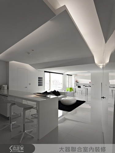 data 空間如何白得有條有理?文章看下去你就知道!「空間不能有圓弧性的設計、整體基調僅能以白、黑、銀三色為主」,黃裕傑設計師依照著屋主給的要求,讓這間中古屋以全白方式呈現,空間裡有如閃電形體的凹摺線條,輔以燈光照明的運用,表現出純白空間的強烈勁道。 空間裡會使用閃電形體的凹摺線條,是從屋主所喜好的直線與稜角元素裡營造出來的,黃裕傑設計師利用兩大片板塊構成天花板和主體牆面,結合翻轉、凹摺與連結技術,不僅成功串連各個空間,以及造延伸視覺效果,更重要將設計發揮的淋漓盡致。 為了讓空間不過於冰冷,設計師除了保留大面窗,更在天花板與壁面之間加入了燈光照明,無論是自然光線的照射,或是燈光照明的投射,光線恣意地遊走在空間線條或材質表面上,突顯光影的層層變化,也看見白色空間裡的柔和力道。