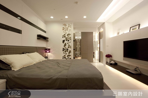 主臥乾淨清爽,衣櫃門片二側使用明鏡搭配圖騰,既有裝飾效果也可當作穿衣鏡使用。