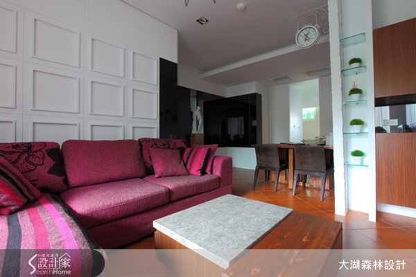沙發背牆利用古典風格中常見的線板語彙挪用設計,讓主牆更具有視覺效果。