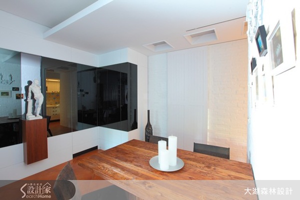 設計師透過樸拙白磚牆保留自然元素,並與簡約俐落的大片黑色鏡面對比交盪出時尚氛圍,客廳部分在沙發背牆規畫出線板語彙的造型牆,而餐廳空間藉由黑鏡設計讓空間感放大,同時也隱藏了牆面的門片,讓空間更形完整。