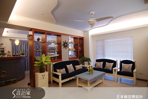 於是設計師利用簡單而溫馨的手法,挑選符合海邊意境風格的傢具、傢飾,讓客廳搖身一變為度假小島。