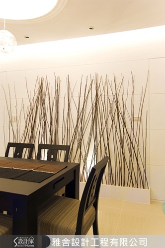 想把自然風情納入空間能怎麼做?不以綠色的假植栽造景,反而以枯木樹林為意象做出立體的牆面設計,讓這些樹枝從牆裡長出來!