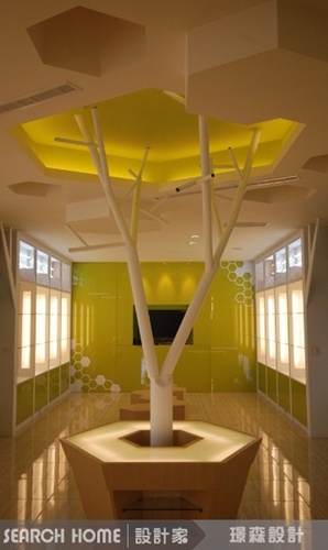 空間除了以蜂巢為靈感來源,在色系搭配上,設計師以青蘋果綠、白色為主,輔以光線照明,讓整體呈現一明亮、清爽的商業空間。另外,在中心位置有一樹狀造型的設計,此為蜂蜜產品的試吃平台,不但成為空間的視覺焦點,也讓來到這的消費者,視覺上能多一點玩味與變化。