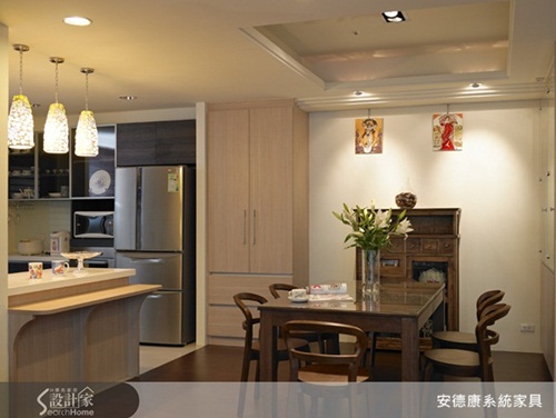 設計師在此處透過系統櫃及天花板劃分不同的使用區塊,讓空間得以區隔,而在櫃體的設計上,客廳的櫃體以封閉式設計為主,強調視覺上的清爽效果,餐櫃則結合展示功能設計,讓屋主收藏的杯盤有擺放空間。