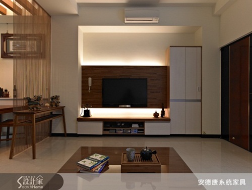 由於客廳空間不大,加以大門打開就是客廳,在無法有獨立的玄關的情況下,設計師在電視牆旁設計了一高櫃,將櫃體賦予多元機能的概念進行設計,藉由機能的整合,不但同時滿足客廳與玄關的收納需求,也讓機能使用更具效率。