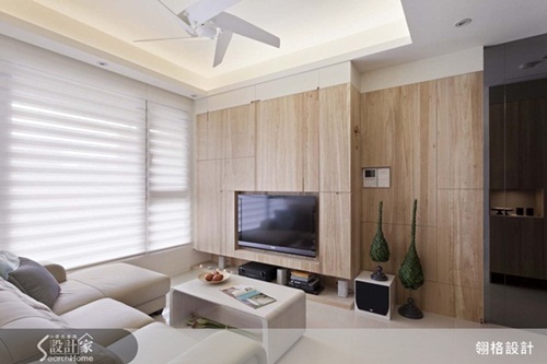 電視牆的設計採封閉的設計概念,並且延伸至旁邊的牆面讓電視牆感覺面積更廣。門片之間的溝縫盡量減至最小,以細緻的線條、完美的表面帶出簡潔俐落的質感,營造出北歐風的居家空間。