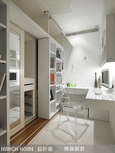 秘技1.雙層櫃複合雙機能 在坪數有限的條件下,設計師透過將書房與更衣室整合在一起,不但空間與空間相互重疊,透過雙層櫃的設計,也將衣櫃隱藏於書櫃後方,中間還隱藏了穿衣鏡。藉由精巧的設計,讓機能整合於一,也讓不同機能空間得以適切融合。