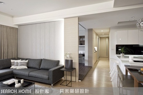 客廳與餐廳之間,藉由不同材質的地坪做為區隔手法,既能讓空間有所區隔、獨立,同時也創造出寬敞的走道與動線,而空間相互連通,空間感自然放大。