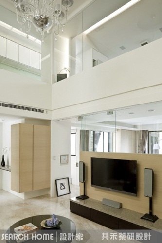 在挑高空間中,設計師使用了清玻璃作為主要的隔間手法,視線上的穿透首先帶來放大空間的效果,而在動線規劃上,刻意選擇過合宜大小的傢具比例,加上空間格局的設定,也更營造出流暢舒適的動線與空間感。