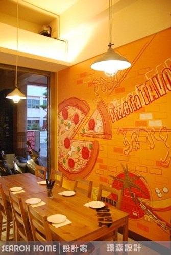 店內牆面稻褐色為主的披薩店,同時搭配。