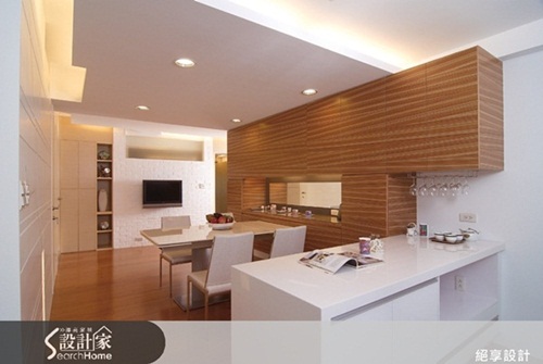 電視牆結合書櫃的排列組合,成功化解樓梯下方的不規則牆面視覺感,利用樓梯下方的空間做成層層分明的書架,不僅順應空間尺寸的適用合理性,也為客餐廳之間的面牆,提供最完善的機能需求。