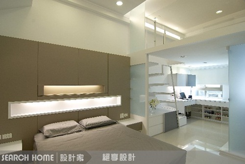 開放式的樓梯設計,以具視覺穿透感的層板,創造空間通透放大的效果,兩層櫃體的安排,替房間規劃了適當的收納容量,同時在維持空間視覺清爽效果之間得到平衡。