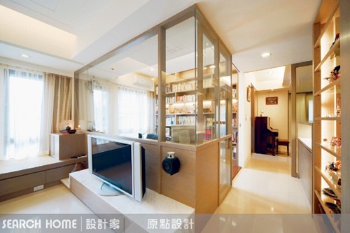 用玻璃牆串連整體空間 客廳與書房之間的隔間和走道上實牆全部改用玻璃牆代替,打破一般走道常見的陰暗感與狹長感,不但增加室內採光,讓室內空間立即明亮,整體設計也因此變得更有一致性。